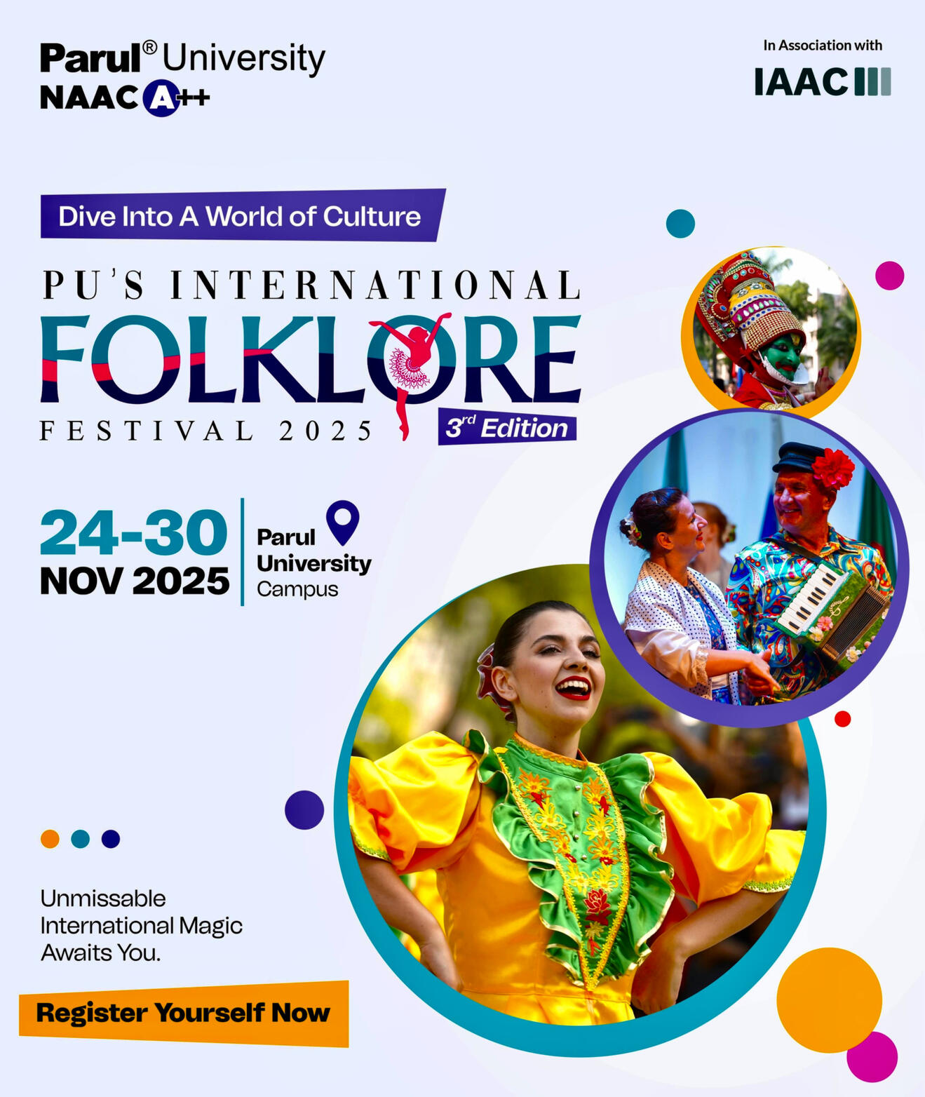 Parul University, in collaboration with the International Alliance for Art and Culture (IAAC), the International Organization of Folk Art (IOV), and IOV India Section, is organising the third edition of the International Folklore Festival. The festival will be held from November 24 to 30, 2025.