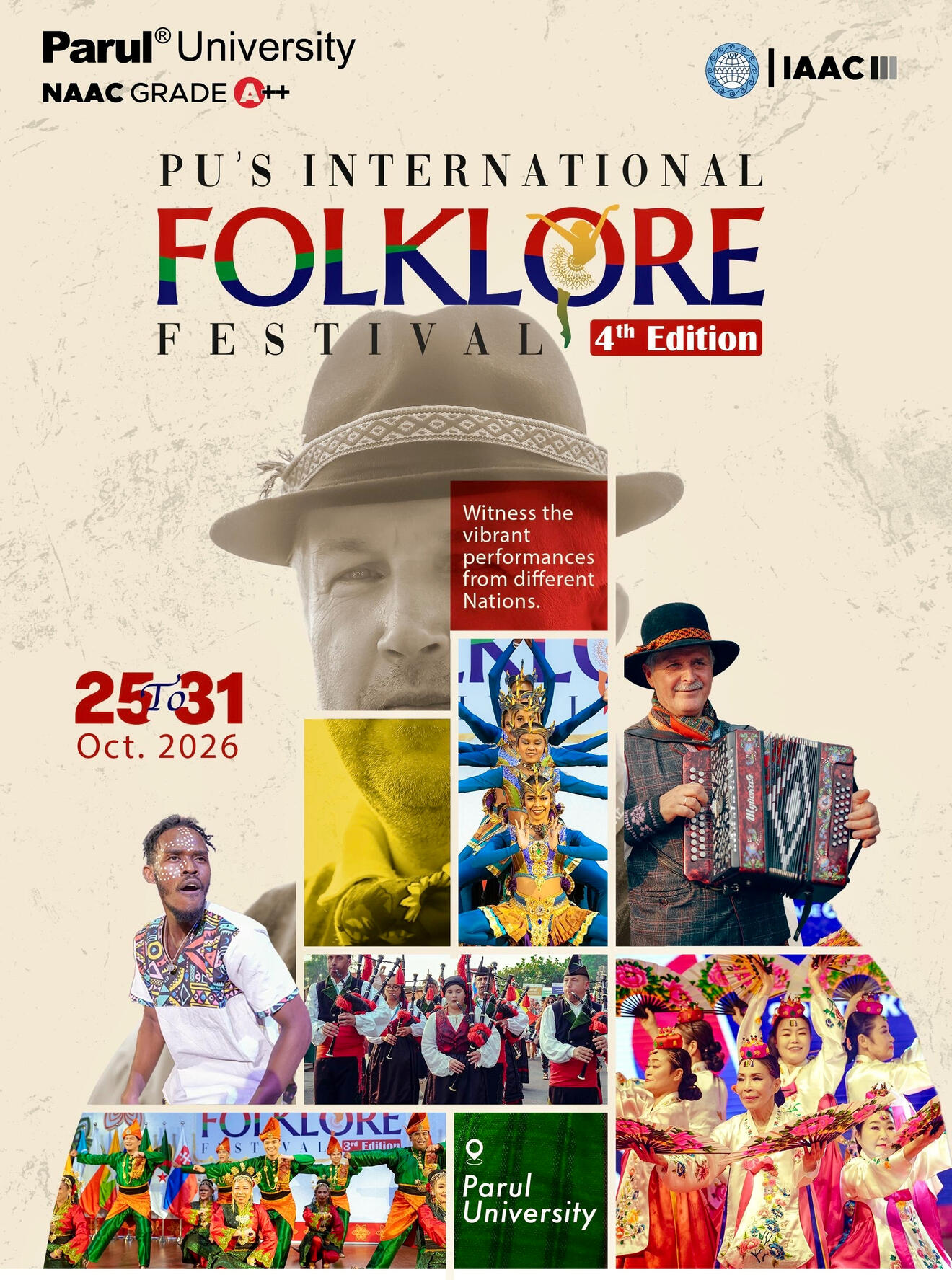 Parul University, in collaboration with the International Alliance for Art and Culture (IAAC), the International Organization of Folk Art (IOV), and IOV India Section, is organising the fourth edition of the International Folklore Festival. The festival will be held from October 25 to 31, 2026.